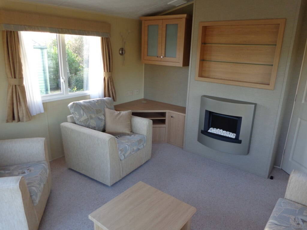 These popular caravans include double glazing and central heating. Closed lounge area with freestanding furniture and front opening doors onto timber decking. Separate dining kitchen, two bedrooms, main with ensuite.